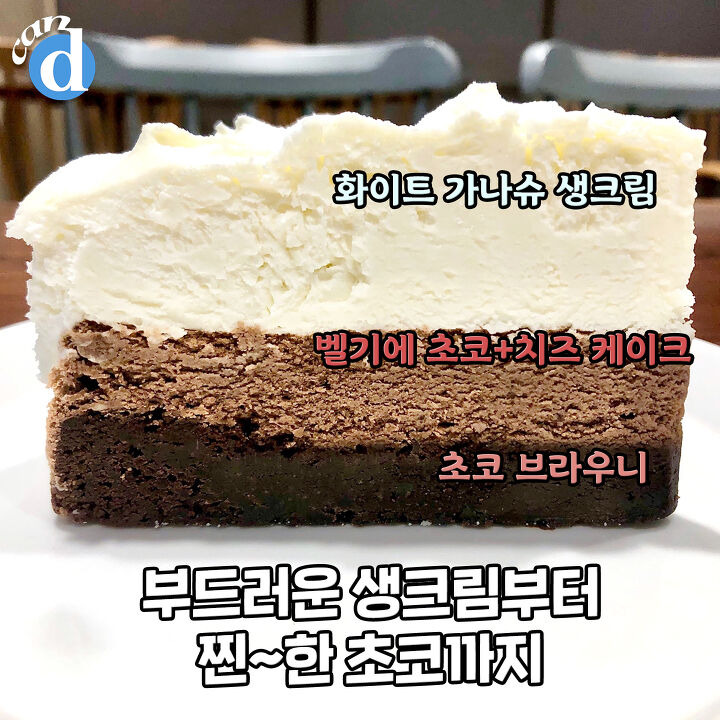 3층엔 부드러운 화이트 가나슈 생크림, 2층엔 진한 벨기에 초코+치즈 케이크, 1층엔 꾸~덕한 브라우니에요.