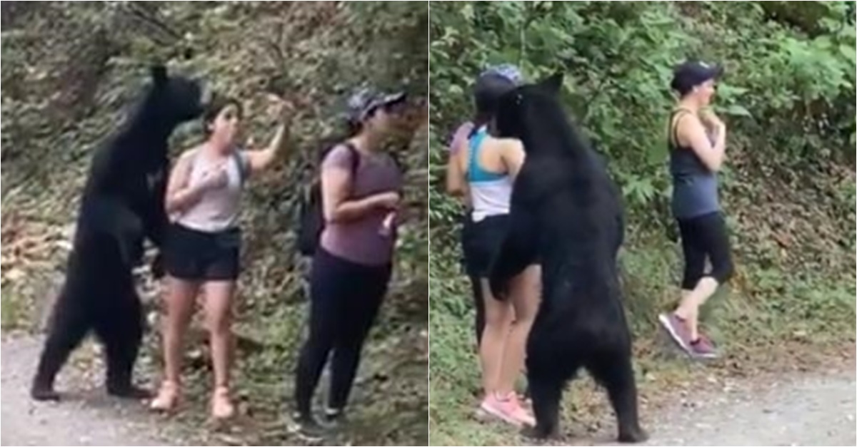 소셜미디어 등에 공개된 영상 속에서 이 곰은 두 발로 서서 거의 사람을 부둥켜안은 자세로 한참 냄새를 맡고 다리를 살짝 깨물기도 했다.