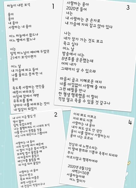 A 씨는 '사랑하는 내 웅아, 어느 하늘에서 왔드냐', '어느 날 내 가슴에 파고 들어 나를 울리고 웃게한 너', '죽도록 사랑하는 연인을 애틋하게 바라보듯 날마다 너를 바라보는 것이 내 일상이 됐지' 등의 구절로 진심을 표현했는데요.