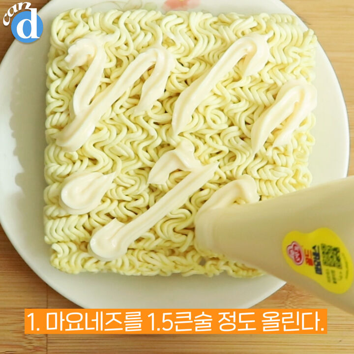 식빵에 잼 바르듯 생라면에 마요네즈를 쓱쓱 펴 발라요.