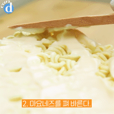 마요네즈가 전자레인지에 들어갔다 오더니 라면 사이에 스며들었어요.