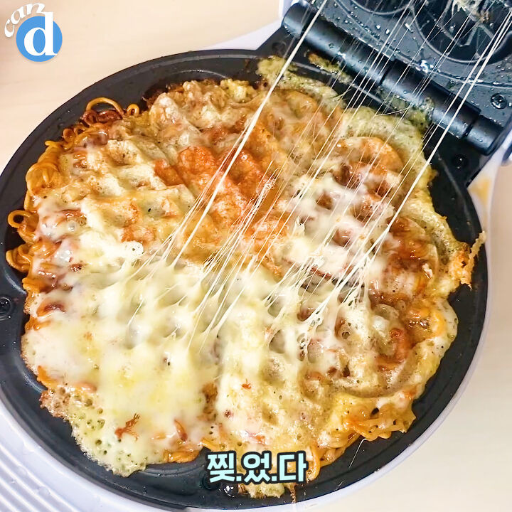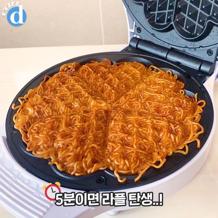 와플메이커에서 익어가는 동안 맛있는 라면 냄새가 진동했어요.