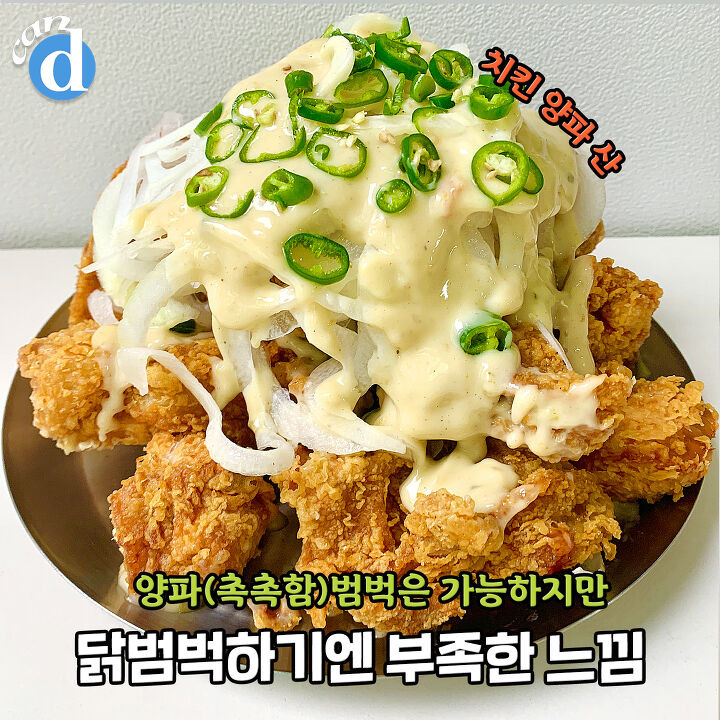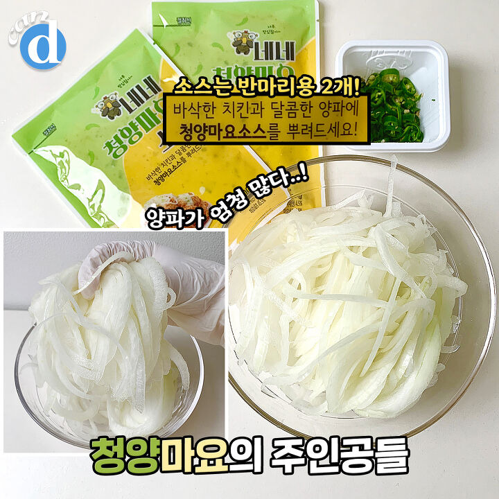 치킨 위에 양파 올리고 청양마요소스와 청양고추 뿌리면 완성!