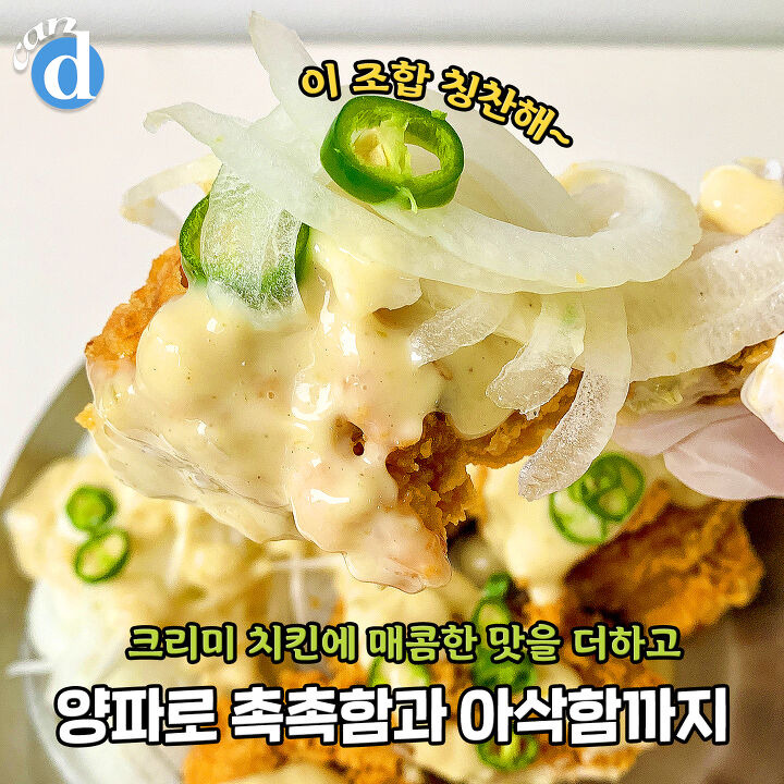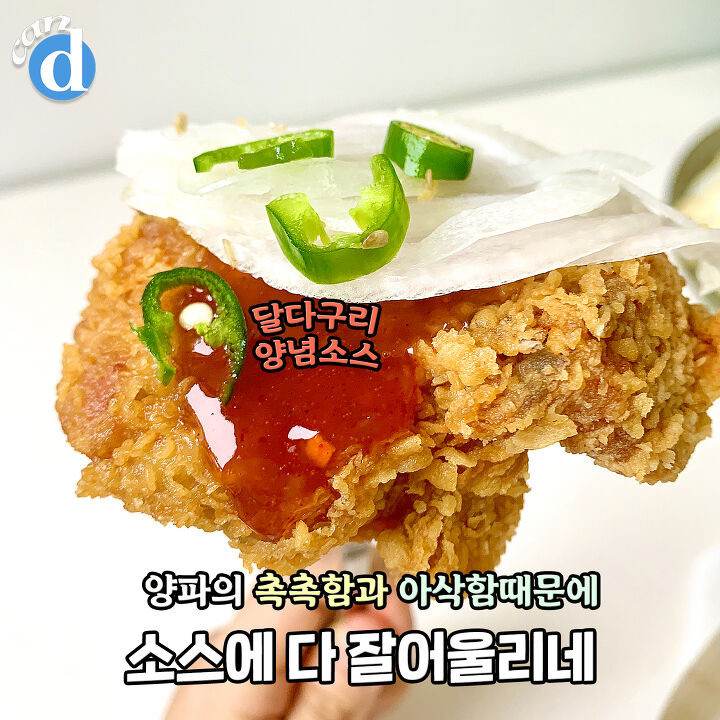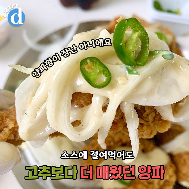 양파엔 수분감이 있어서 소스와 범벅이 가능하지만 치킨에 범벅하기엔 다소 부족한 느낌!
