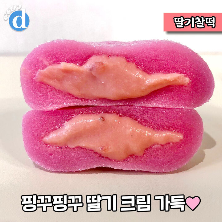 딸기 맛부터 살펴볼게요. 반 가르자마자 딸기 크림이 뿜어 나오는 중.