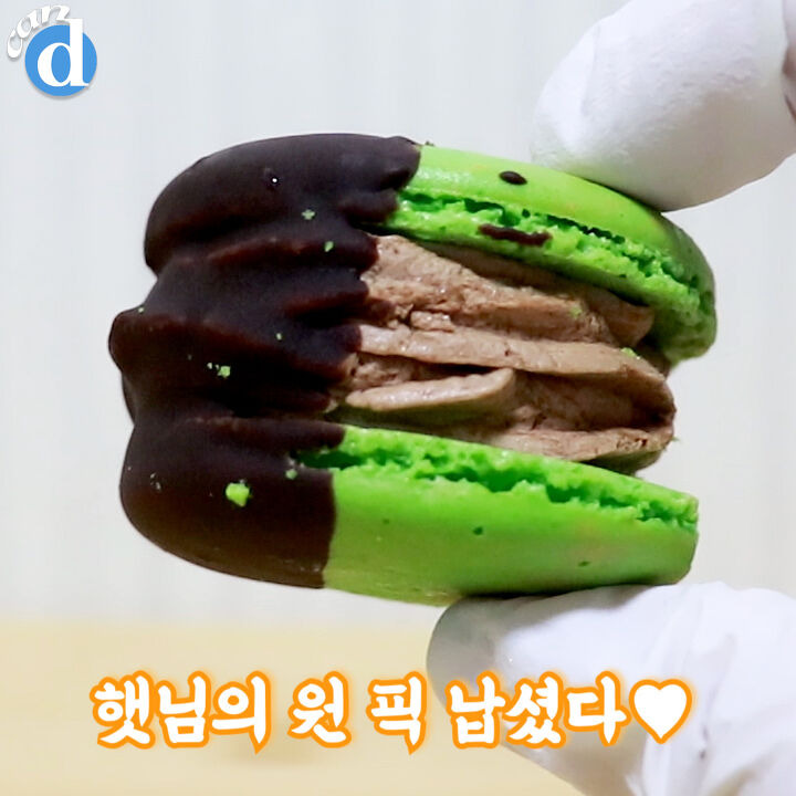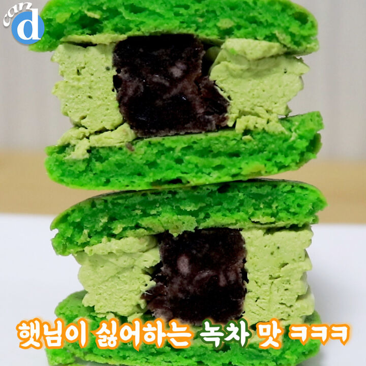팥을 품은 이 마카롱의 정체는 입짧은 햇님이 싫어하는 ‘녹차맛’이에요.