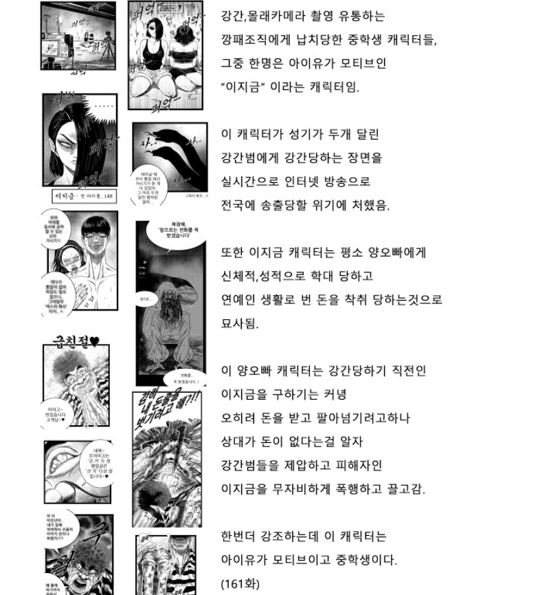 158화에서는 중학교1학년 캐릭터를 성적 대상화하기도 했고, 161화에서는 아이유를 모티브한 것으로 보이는 중학생 '이지금' 캐릭터를 잔혹하게 묘사했습니다.