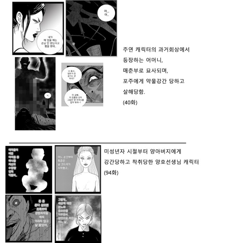 94화에서는 미성년자 시절부터 양아버지에게 강간당하고 착취당한 양호 선생님 캐릭터가 등장했고, 102화에서는 여중생이 학교에서 권력을 잡기 위해 강한 남학생에게 몸을 댓가로 내겁니다.