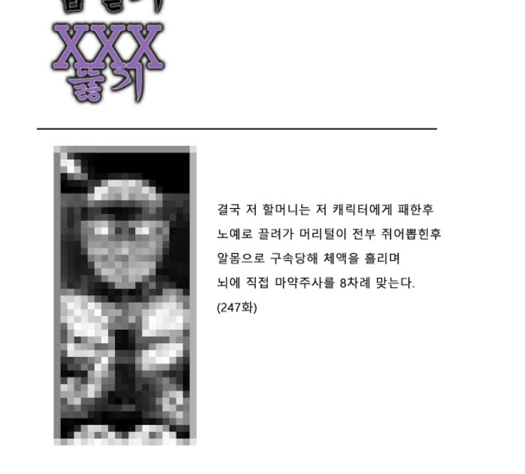 심지어 247화에서는 할머니가 노예로 끌려가 알몸으로 구속당하고, 체액을 흘리며 뇌에 직접 마약 주사를 8차례 맞는다고 묘사됩니다.