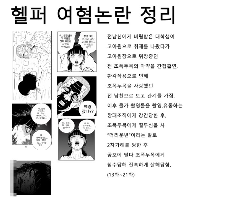 하지만 최근에는 "도를 넘었다"는 지적이 빗발치고 있습니다. 13~21화는 전남친에 버림받은 대학생이 몰카 촬영물을 촬영 유통하는 깡패 조직에게 강간을 당하다가, 조폭 두목에게 참수당하는 장면이 있었습니다.