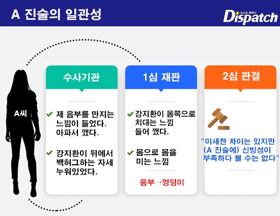 ② 다음으로, 진술의 일관성 부분이다. 강지환은 A의 진술이 변했다고 지적했다. 경찰, 검찰, 재판을 거치며 피해 부위가 달라졌다는 것. 신빙성에 의문을 제기했다.