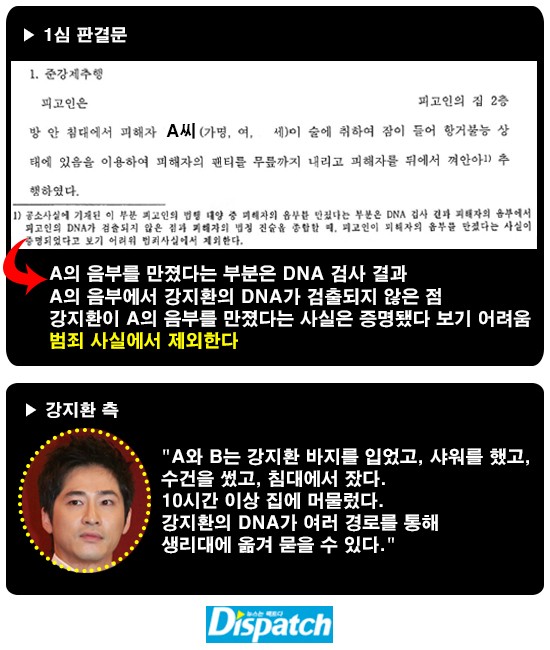 1심 재판부는 A의 음부에서 DNA가 검출되지 않은 점을 고려, "강지환이 A의 음부를 만졌다는 사실은 증명되지 않는다"며 범죄사실에서 제외했다.
