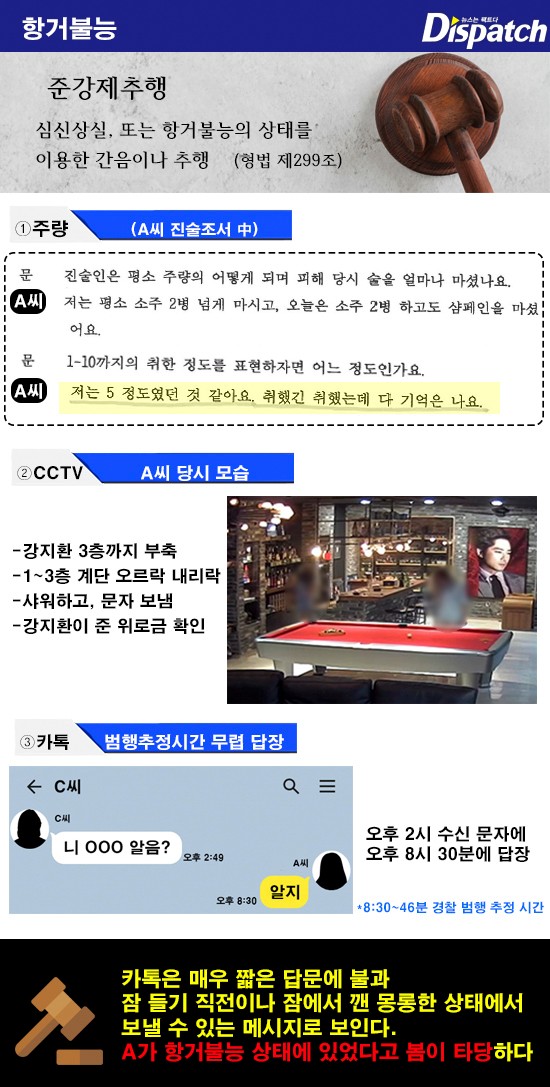강지환에게 적용된 혐의는 준강제추행이다. 강지환은 '준'에 의문을 제기했다. A가 사건 추정 시각인 오후 8시 30분에 "(누구) 알지"라는 카톡을 보냈다는 것.