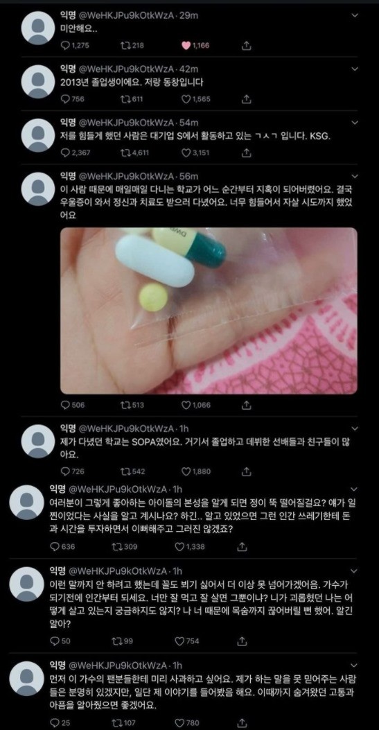 지난 12일 누리꾼 A 씨는 익명의 한 트위터 계정에 글과 사진을 남겼는데요. "이때까지 숨겨왔던 고통과 아픔을 알아줬으면 좋겠다"라며 유명 아이돌에게 학교 폭력을 당했다고 주장한 것.
