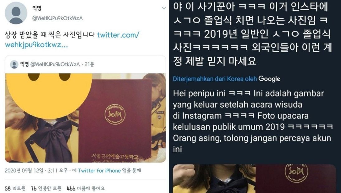 네티즌들이 의혹을 제기하자. 그는 알약을 손바닥에 올린 인증 사진을 게재 하기도 했는데요. 또한 교복을 입고 상장을 든 사진을 올리며 자신이 슬기와 같은 졸업생임을 주장합니다.