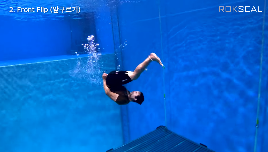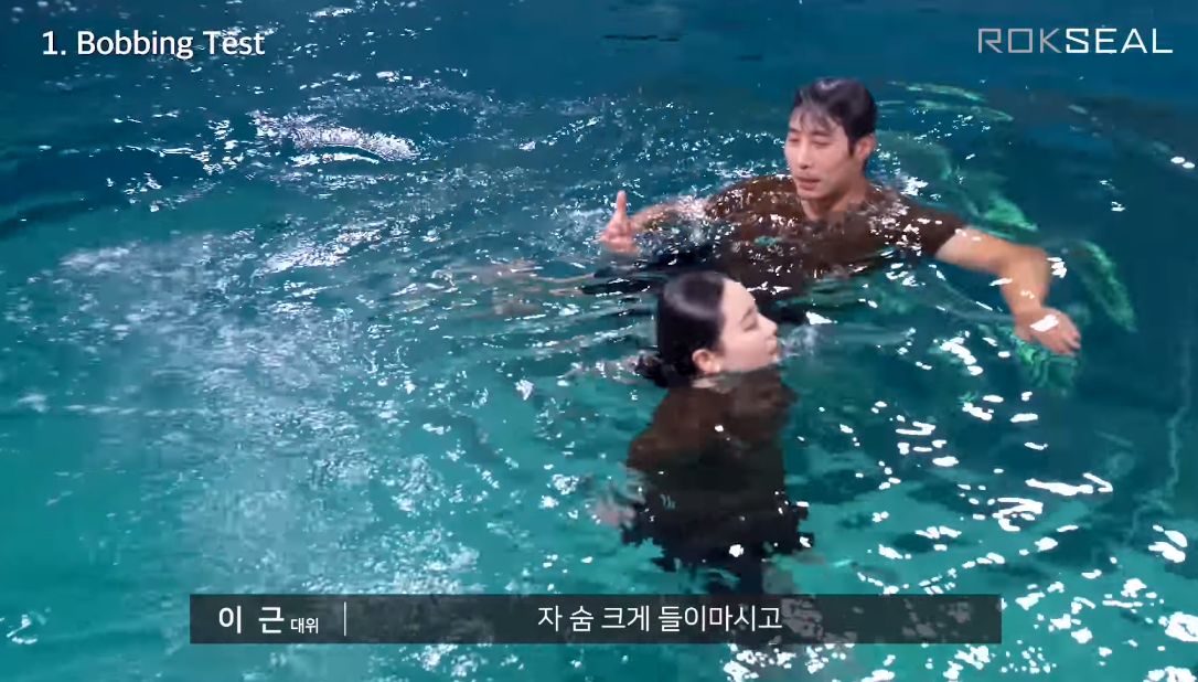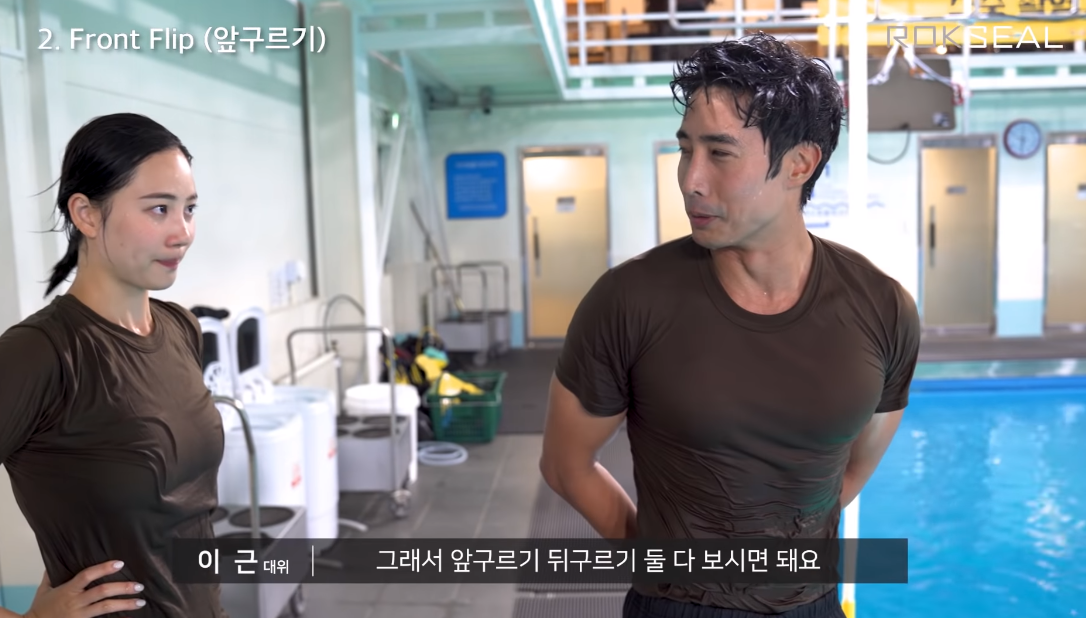 그 다음 훈련은 앞구르기와 뒷구르기. 이근 대위는 부력 컨트롤과 동시에 이 동작들을 선보였는데요. 박찬이 강사는 앞구르기를 한 번에 성공해 감탄을 자아냈습니다.