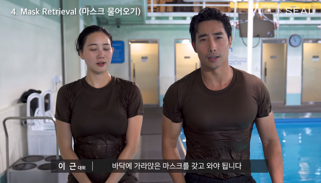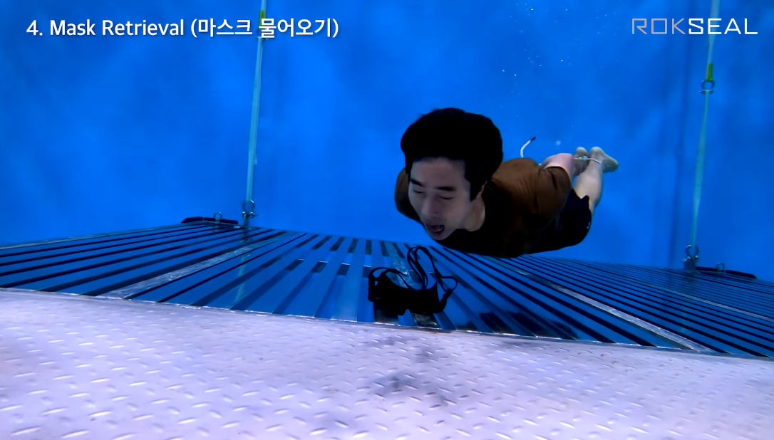 마지막 테스트, 마스크 물어오기입니다. 수영장 바닥에 던져져 있는 마스크를 치아로 물어오는 것. 이근 대위는 "내려가서 목을 많이 눕혀야 한다"고 조언했고, 박찬이 강사도 단번에 해냈습니다.
