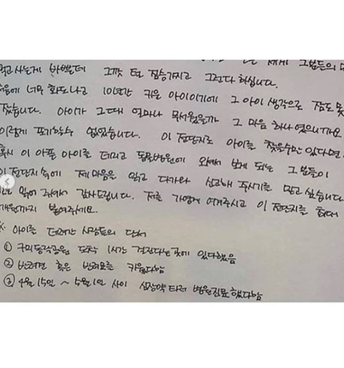 이어 "이상한 직감에 사돈을 추궁한 지 4개월 만에, 사돈 지인이란 분이 아이를 몰래 인터넷 카페로 만난 알 수 없는 부부에게 분양했다 하더라"며 "하늘이 무너지고 앞이 깜깜해졌다"고 호소했습니다.
