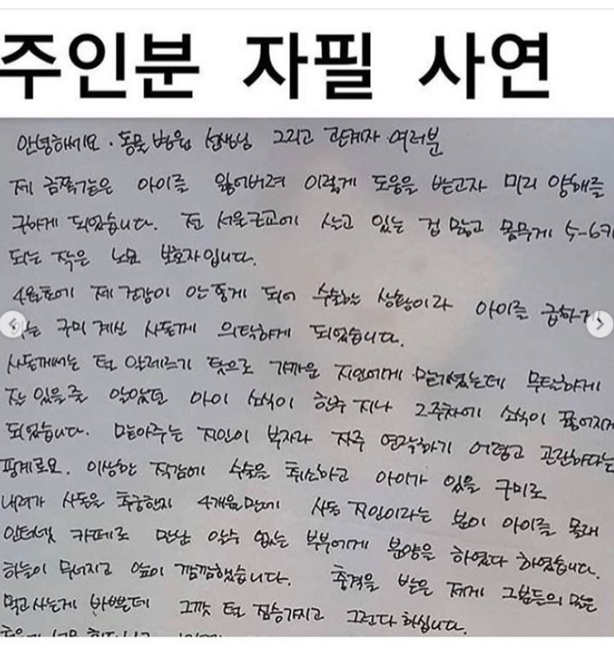 사연자의 자필 사연도 공개됐습니다. 사연자는 "사돈께서 털 알레르기 탓으로 가까운 지인에게 맡기셨는데, 이 아이 소식이 2주차에 끊어졌다. 맡아주는 지인이 부자라 자주 연락하기가 어렵다는 핑계였다"고 말했습니다.