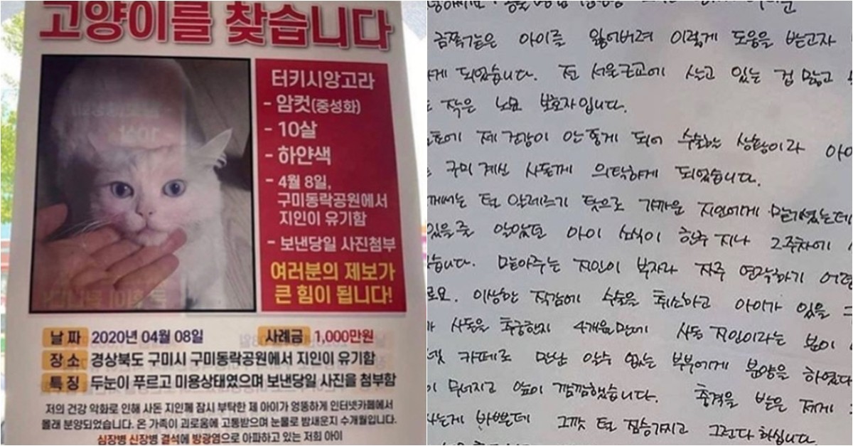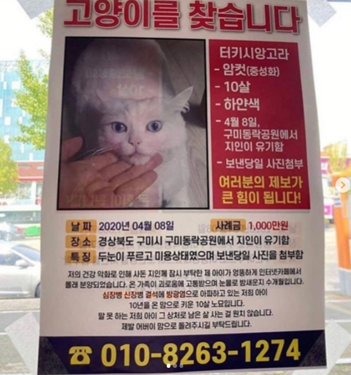 사연자는 "심장병, 신장병, 결석에 방광염으로 아파하고 있는 저희 아이. 10년을 온 맘으로 키운 노묘다. 제발 돌려주시길 부탁드린다"며 1,000만 원 사례금을 걸었습니다.