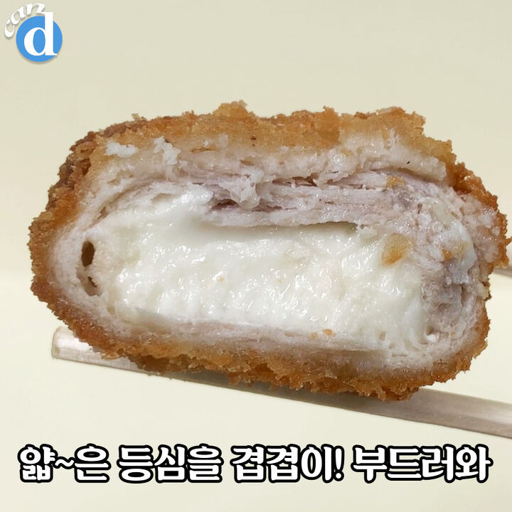 얇은 등심을 겹겹이 쌓아 통치즈를 감쌌어요.