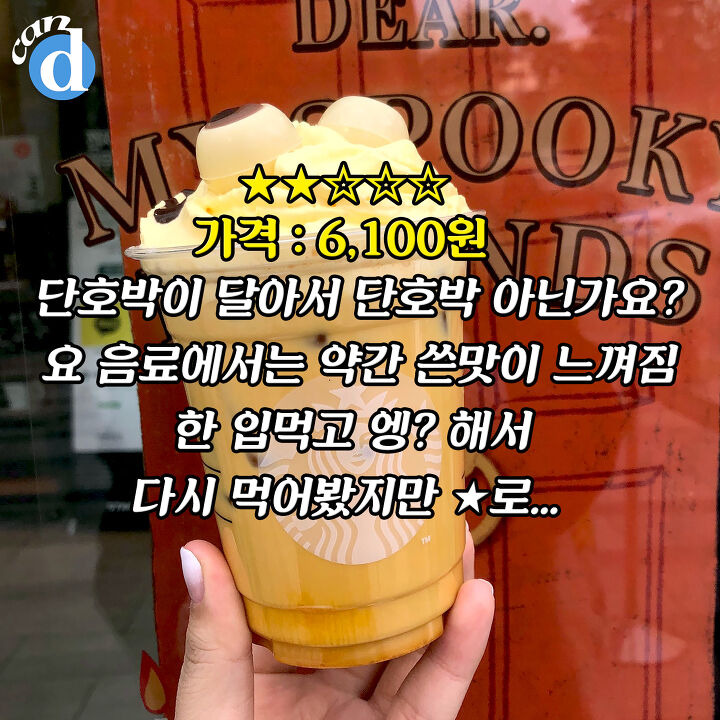 단호박은 쪄서 먹는 게 제일 맛있는 건가 봐요. 음료로 재탄생하니 이도 저도 아니에요.