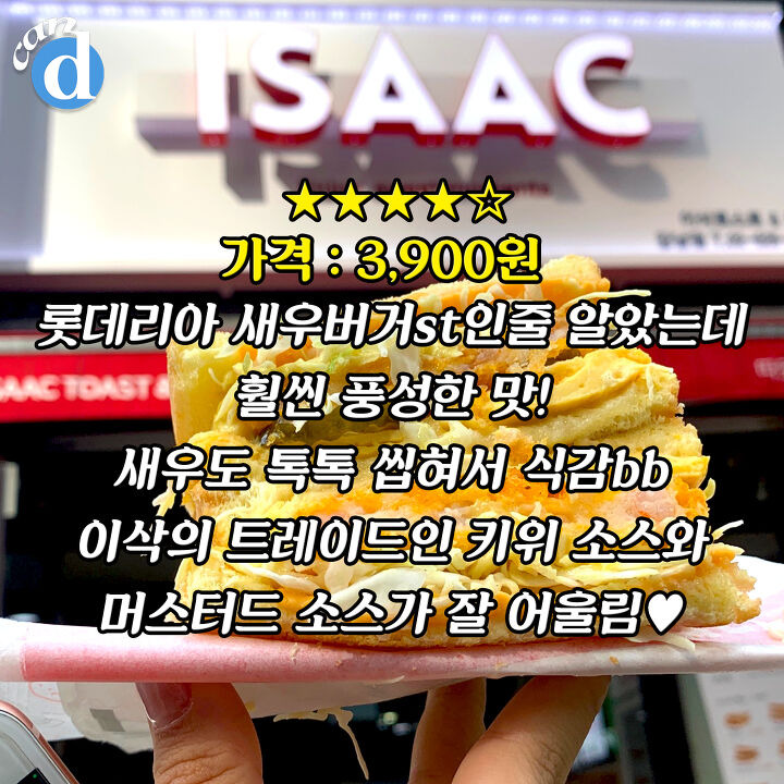 롯데리아 새우버거 단품이 3,300원으로 요 토스트랑 600원 차이가 나는데요. 저는 이삭 토스트를 사 먹겠어요.