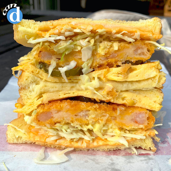 속에는 새우 커틀릿, 치즈, 양배추, 피클, 계란이 들어있어요.