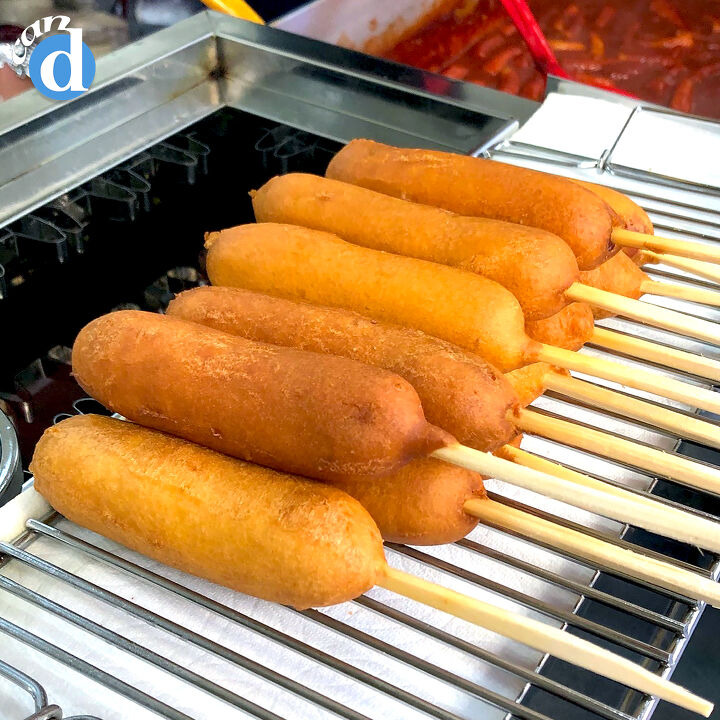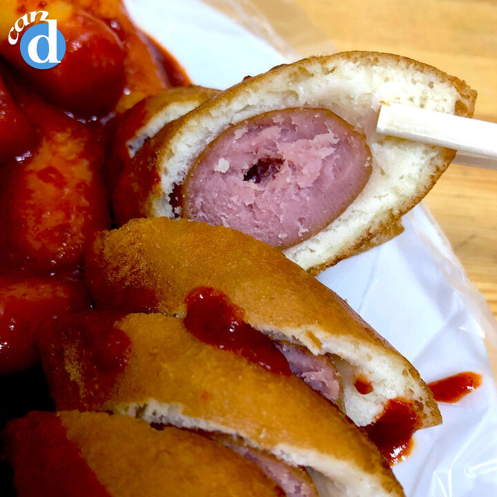 그냥 먹기보다는 떡볶이 국물에 적셔먹기. 떡볶이 소스가 매워서 핫도그가 중화시켜줘요.
