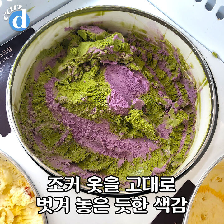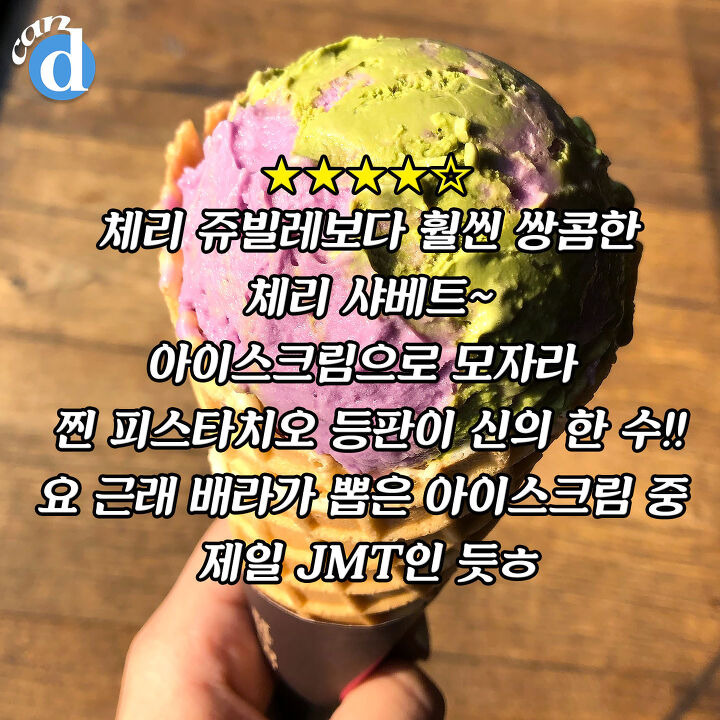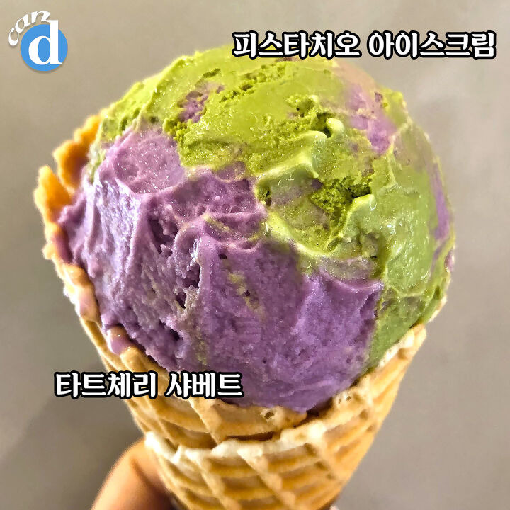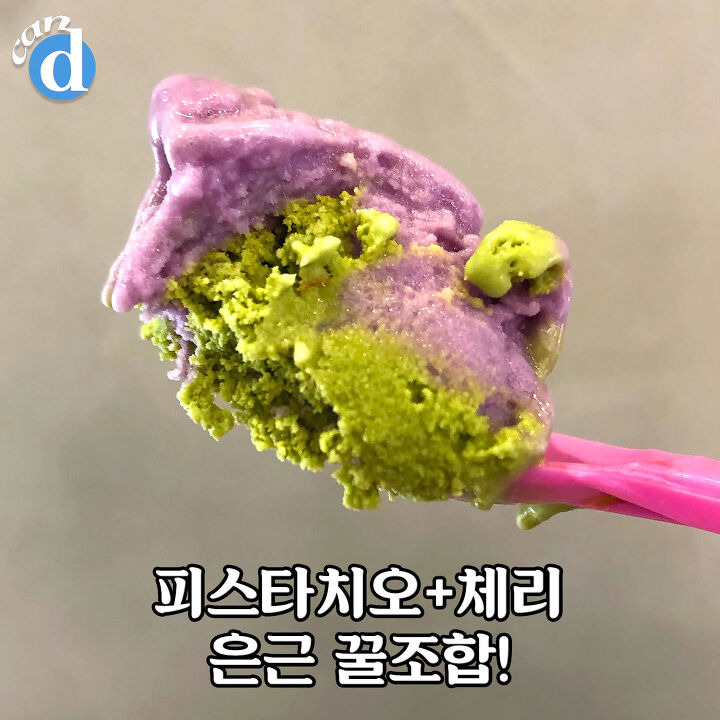 요 조커 아이스크림은 두 가지 맛으로 구성돼있어요. 피스타치오 아이스크림+타트체리 샤베트.
