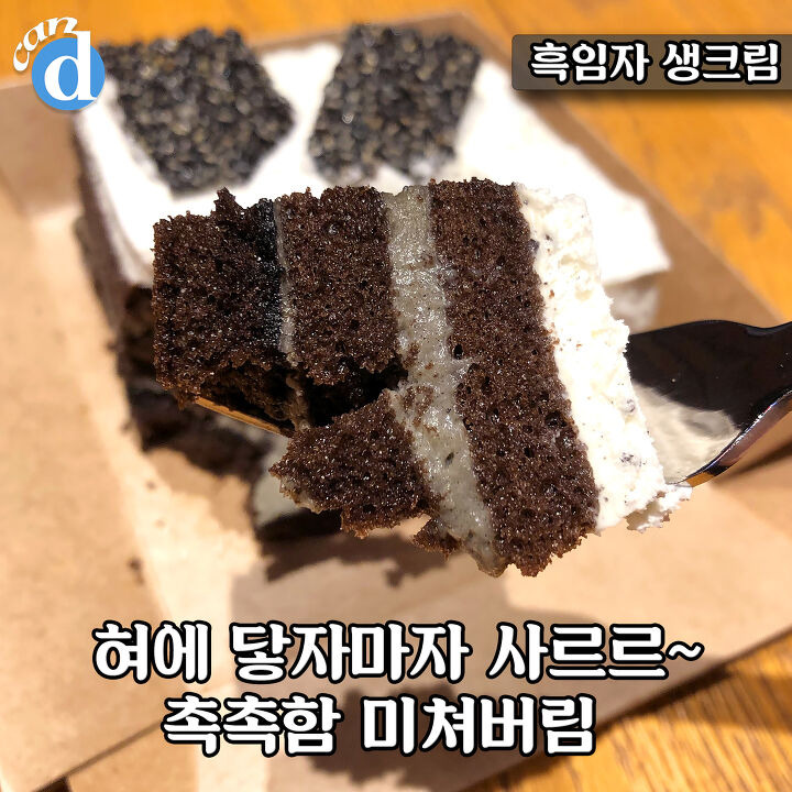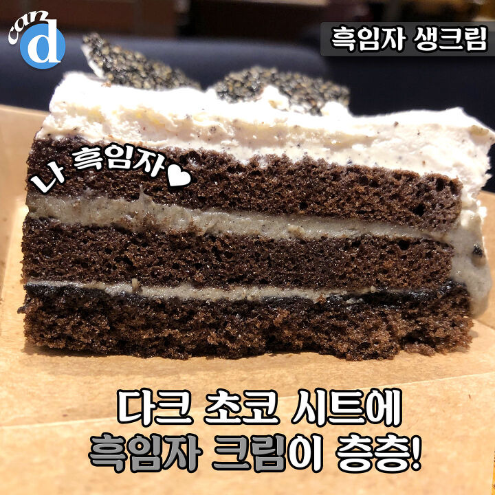 시트, 크림으로 층층이 쌓인 영롱한 케이크 비주얼~ 다크 초코 시트와 흑임자 크림의 만남!