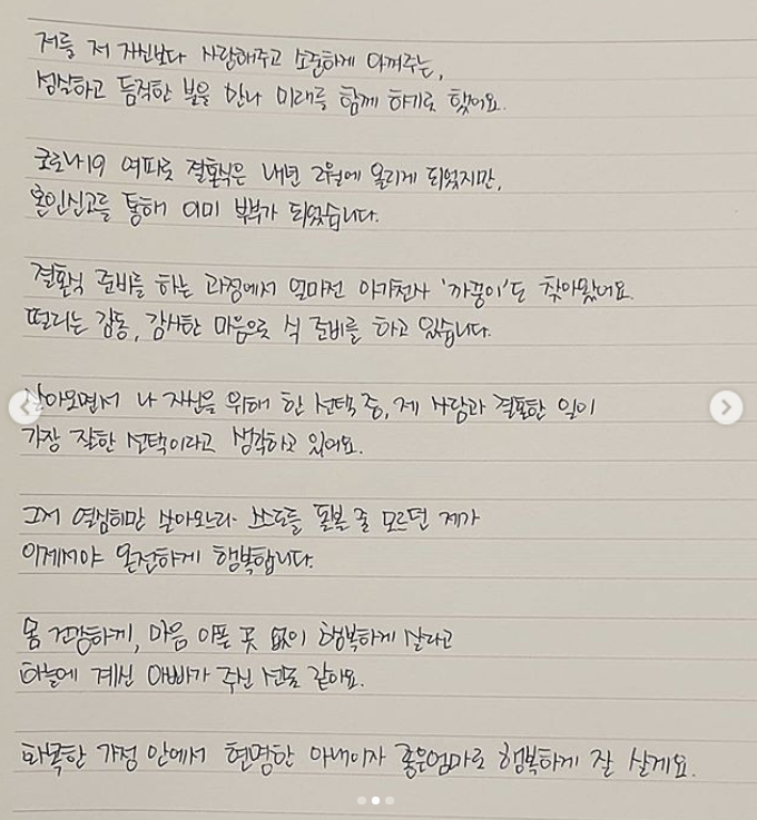그는 "살아오면서 나 자신을 위해 한 선택 중, 제 사람과 결혼한 일이 가장 잘한 선택이라고 생각하고 있다"고 벅찬 감동을 전했다.