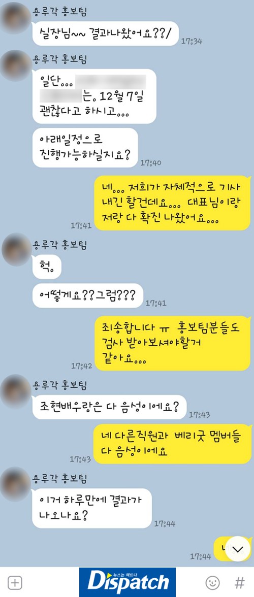 홍보사 측은 “(코로나) 검사 결과가 하루만에 나오냐?”며 되물었다. 배우 소속사는 “네...”라며 짧게 답했다. 더이상 대화는 이어지지 않았다.