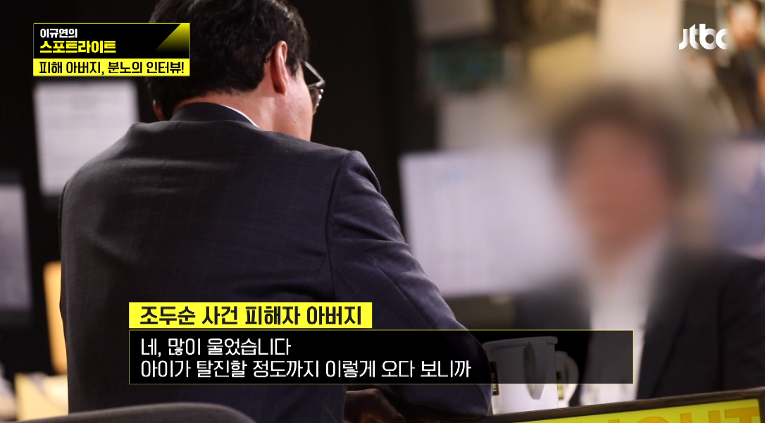 12일 토요일 오후 7시 40분 방송된 JTBC 시사교양 프로그램 '이규연의 스포트라이트'에서는 조두순이 출소하며 벌어진 갖가지 이야기와 법, 감시망의 사각지대에 대해 다뤘다. 오늘 스포트라이트측은 3년 만에 피해자 아버지와 단독 인터뷰를 진행하게 됐다. 피해자의 아버지는 조두순이 절대로 출소해선 안된다고 얘기했다.