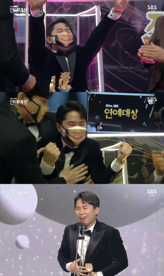 대상 수상자가 호명되는 순간, 김종국은 자리에서 일어나 환하게 웃었다. 그러나 무대에 올라서는 눈시울을 붉혔다.