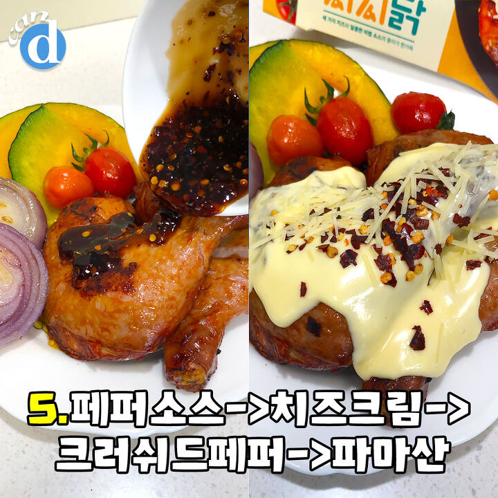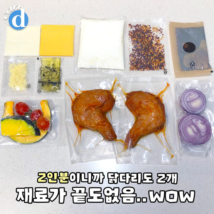 닭다리 2개, 양파, 단호박, 방울토마토, 페퍼 소스, 크러쉬드 페퍼, 크림, 모짜렐라, 체다치즈, 파마산 치즈, 올리브유.