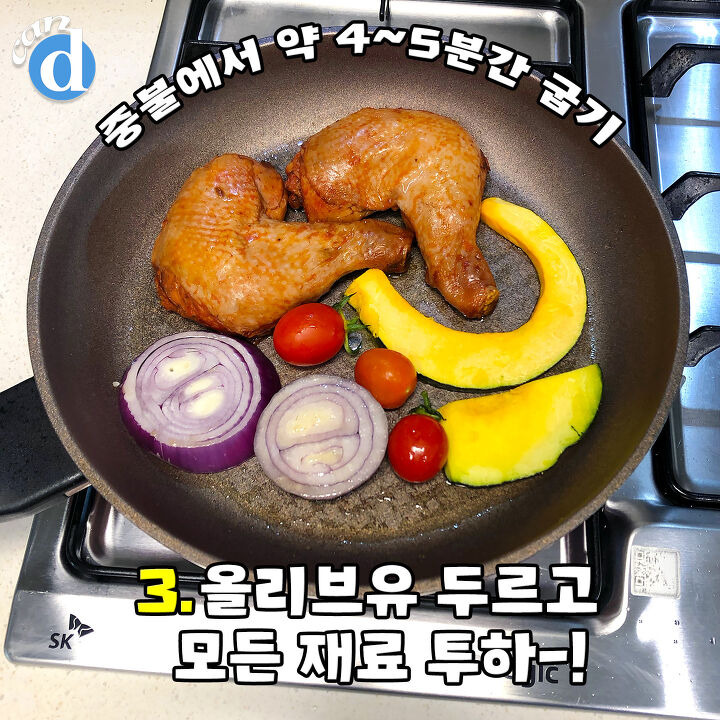 그럼 바로 프라이팬 소환! 동봉된 올리브유를 촤르르 둘러주고 닭다리, 각종 야채들 투하.
