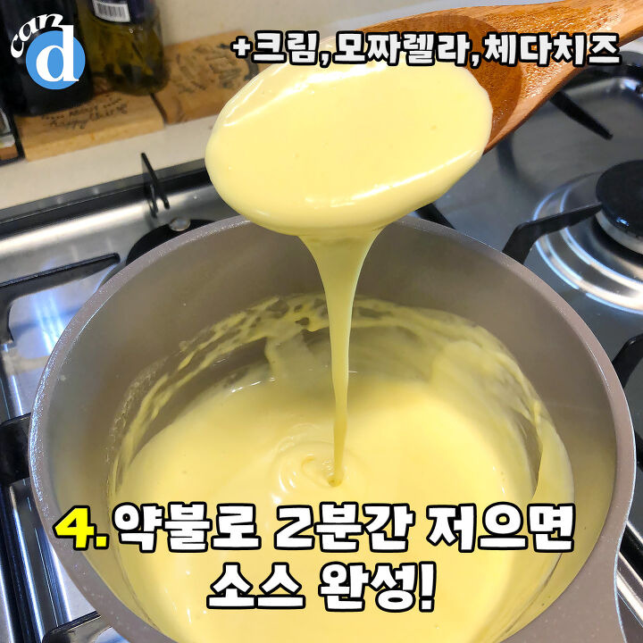 그리고 요 메뉴의 핵심인 치즈 소스를 만들어줄 TIME★ 팬에 크림, 모짜렐라, 체다치즈 넣고 약불로 2분간 잘 저어주면 끝이에요.