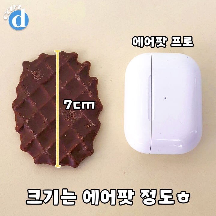가로세로 길이가 딱 에어팟 프로 사이즈! 일반 와플과자보다 작은 대신 조금 더 두꺼운 느낌이에요.