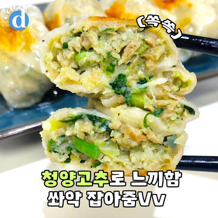 돼지고기, 대파, 부추, 양파, 양배추, 두부, 당면. 그리고 요 만두의 히든 재료! 청양고추가 들어있답니다.