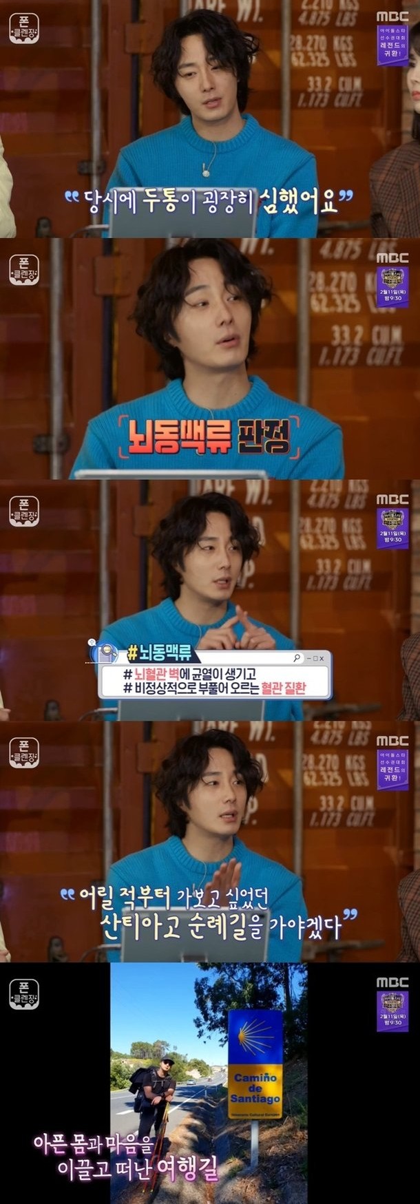 정일우는 “‘황금무지개’ 드라마 찍을 때 두통이 심했다. 뇌동맥류 병 판정을 받았다”며 “혈관이 부풀어 올라 터지면 뇌출혈로 죽는 거다. 언제 터질지 모른다”고 전했다.
