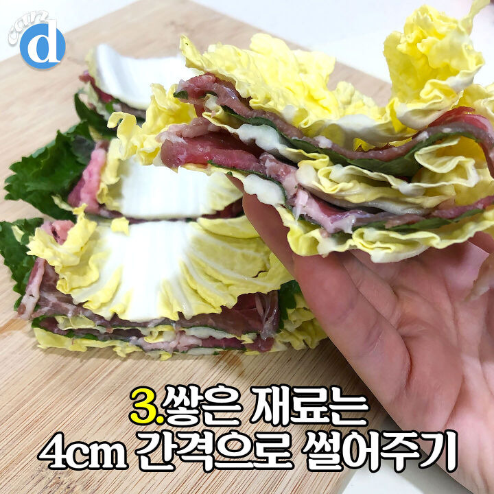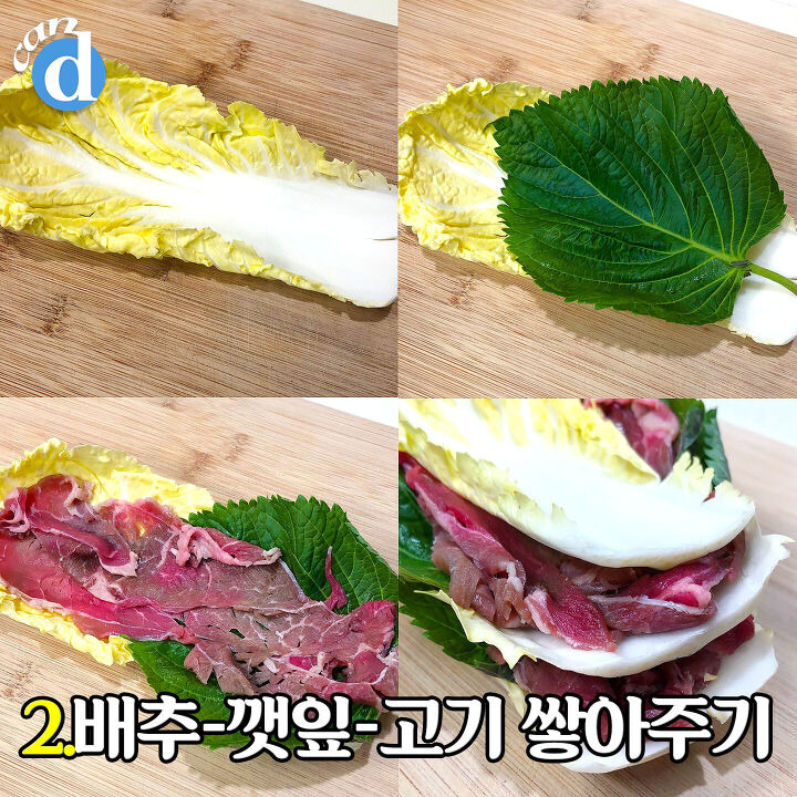 그리고 본격 재료 준비. 배추-깻잎-소고기 순으로 2층 쌓아주고