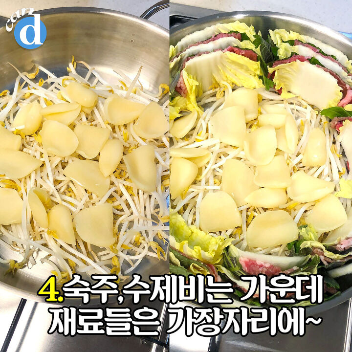 그리고 둥글 납작한 전골냄비에 숙주, 수제비를 가운데에 깔아주기.