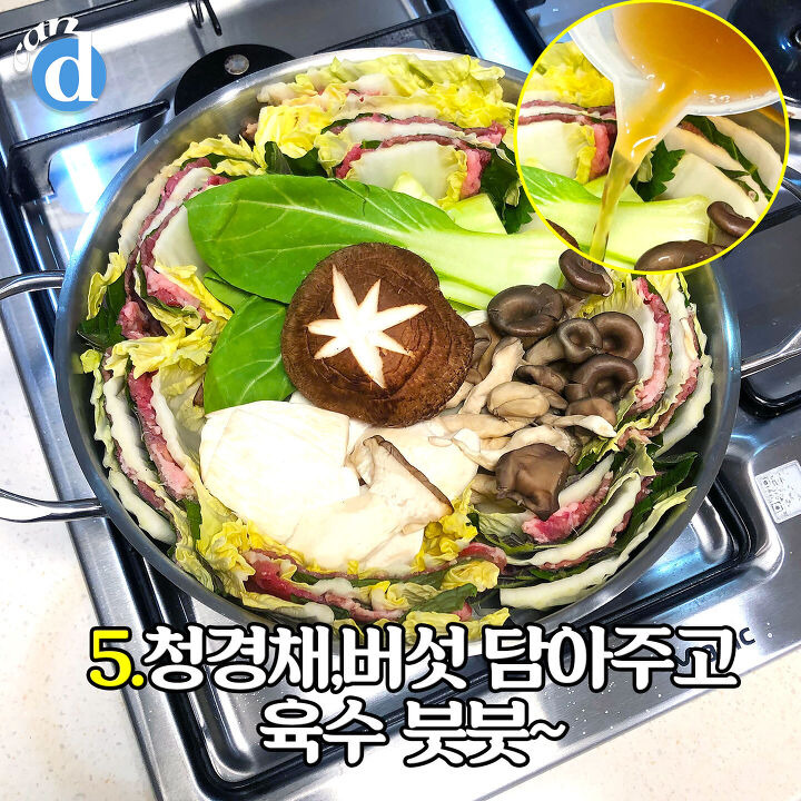마지막으로 가운데 빈 공간에 청경채, 버섯을 담아주면 우리가 알던 밀푀유 나베 그 모습이 탄생해요ㅋㅋ