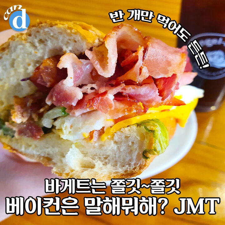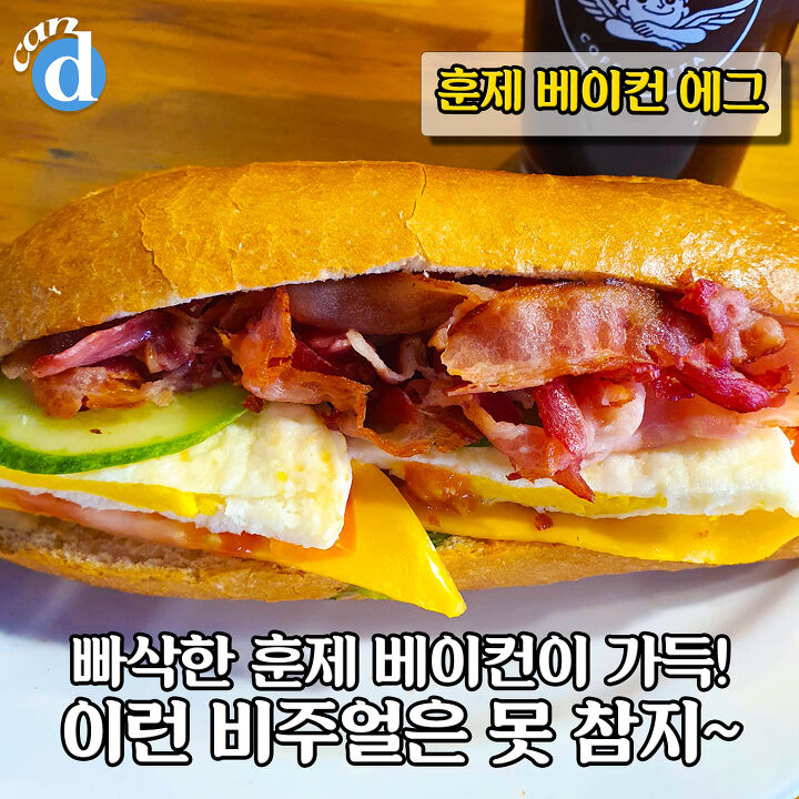 훈제 베이컨과 치즈, 계란프라이, 각종 야채들이 빵 사이에서 존재감을 뿜뿜 드러내고 있어요.