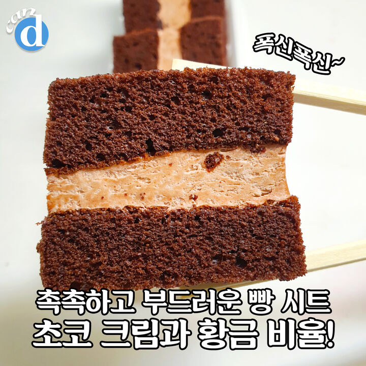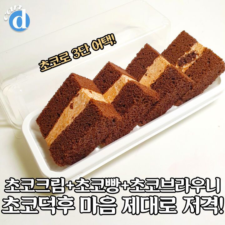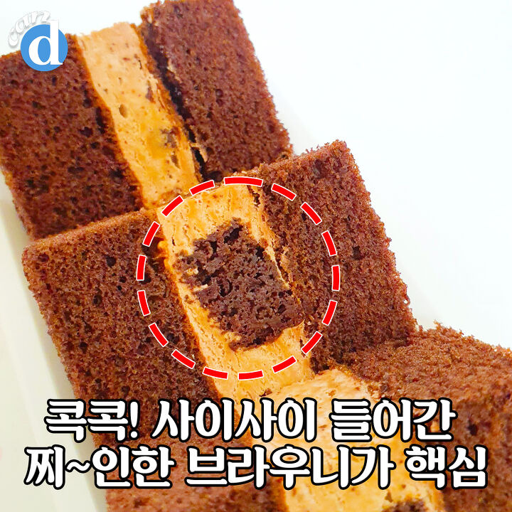 벽돌 모양의 빵 사이에 초코크림이 반듯하게 들어있고 크림 사이에는 꾸덕해 보이는 브라우니가 박혀있어요.