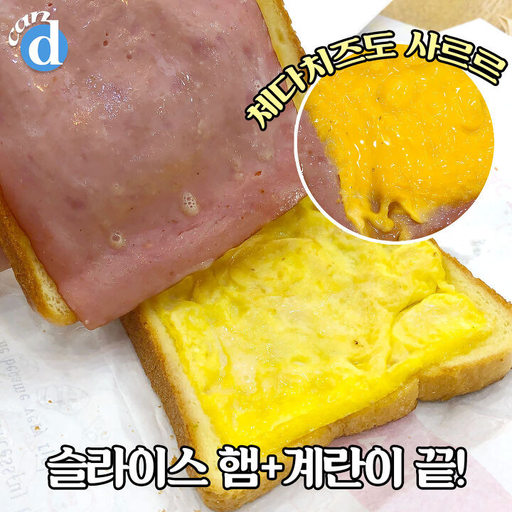 소스 발린 빵 밑에는 슬라이스 햄과 치즈, 계란이 차곡차곡 들어있어요.