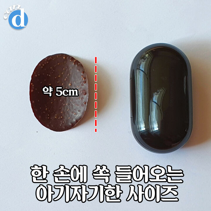 사이즈는 갤러시 버즈 보다도 작아요. 세로로 두면 약 5cm. 한 손에도, 한 입에도 쏙 들어올 것 같아요.