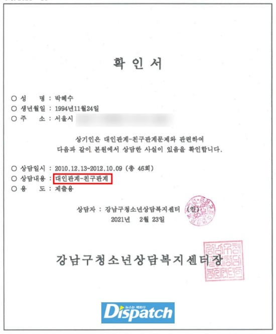 ⑤ 박혜수 상담 확인서 및 담당 선생님의 증언