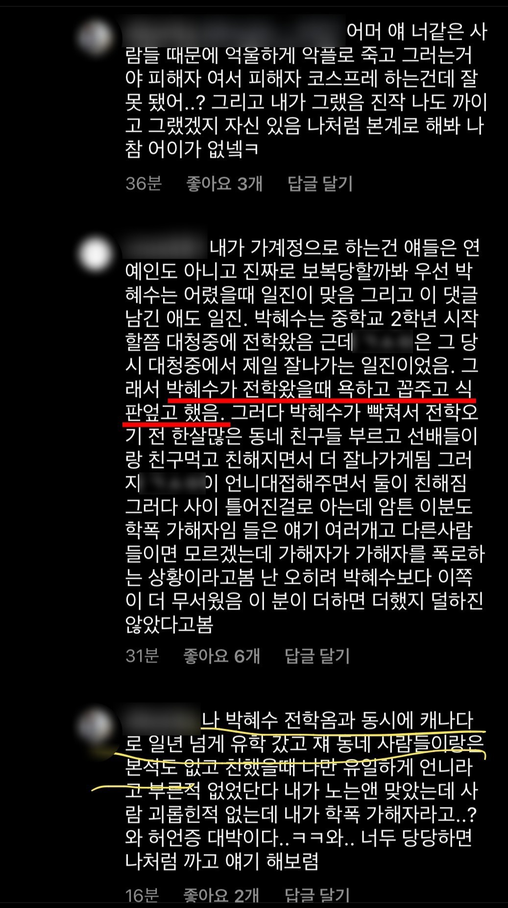 "인생 어떻게 살았길래 옹호하는 의견 하나도 없냐?"는 의견을 봤다. (사실) 학폭 의혹이 터진 후, 대청중 동창끼리 통화를 했다. 다들 "혜수가 (제보글에 나오는) 그런 애가 아닌데"라고 말했다. 하지만 분위기가 너무 한 쪽으로 쏠려 믿지를 않았다.